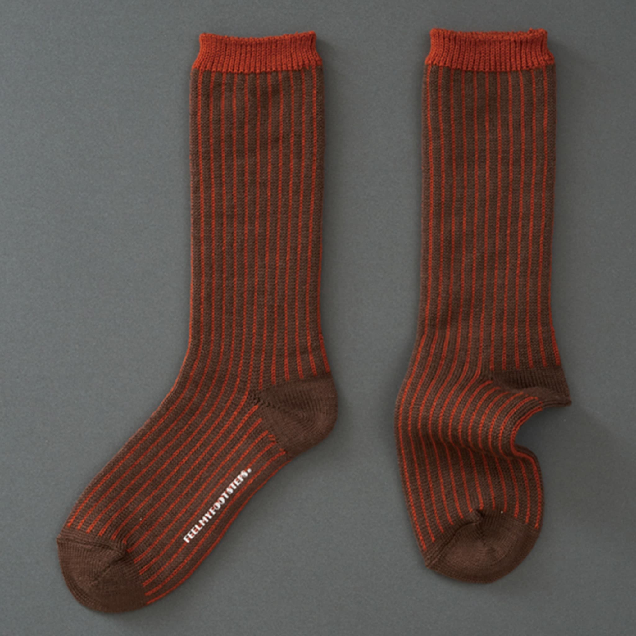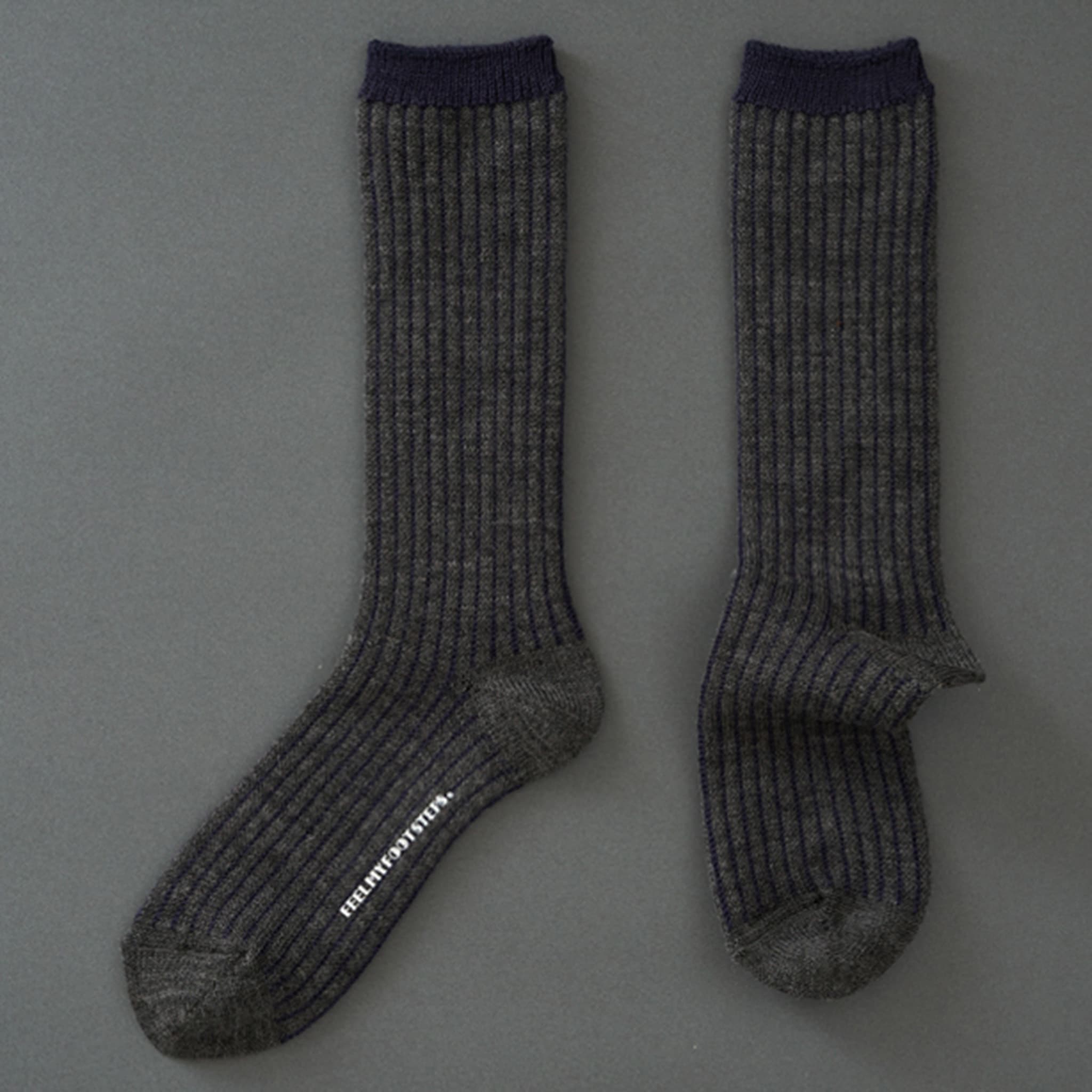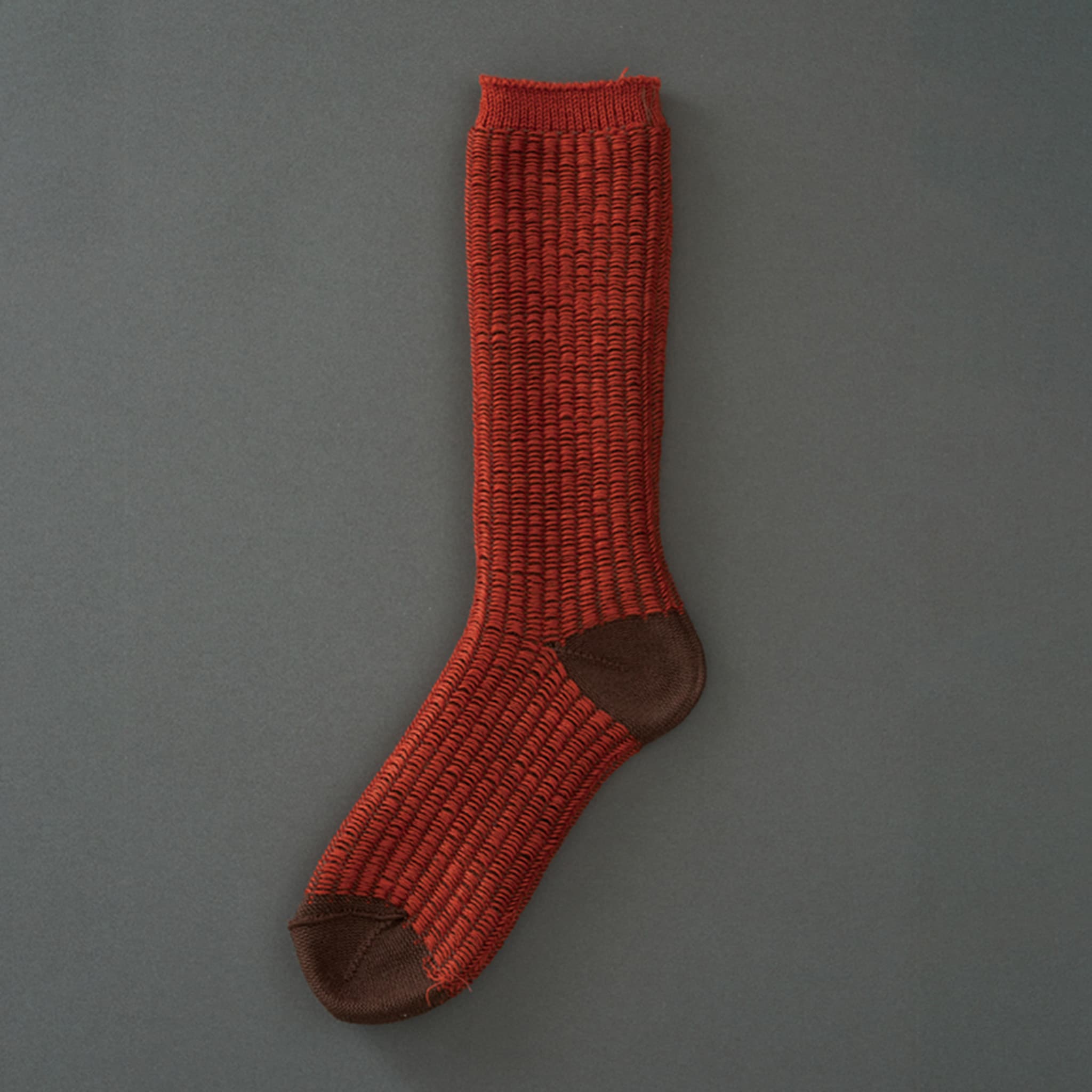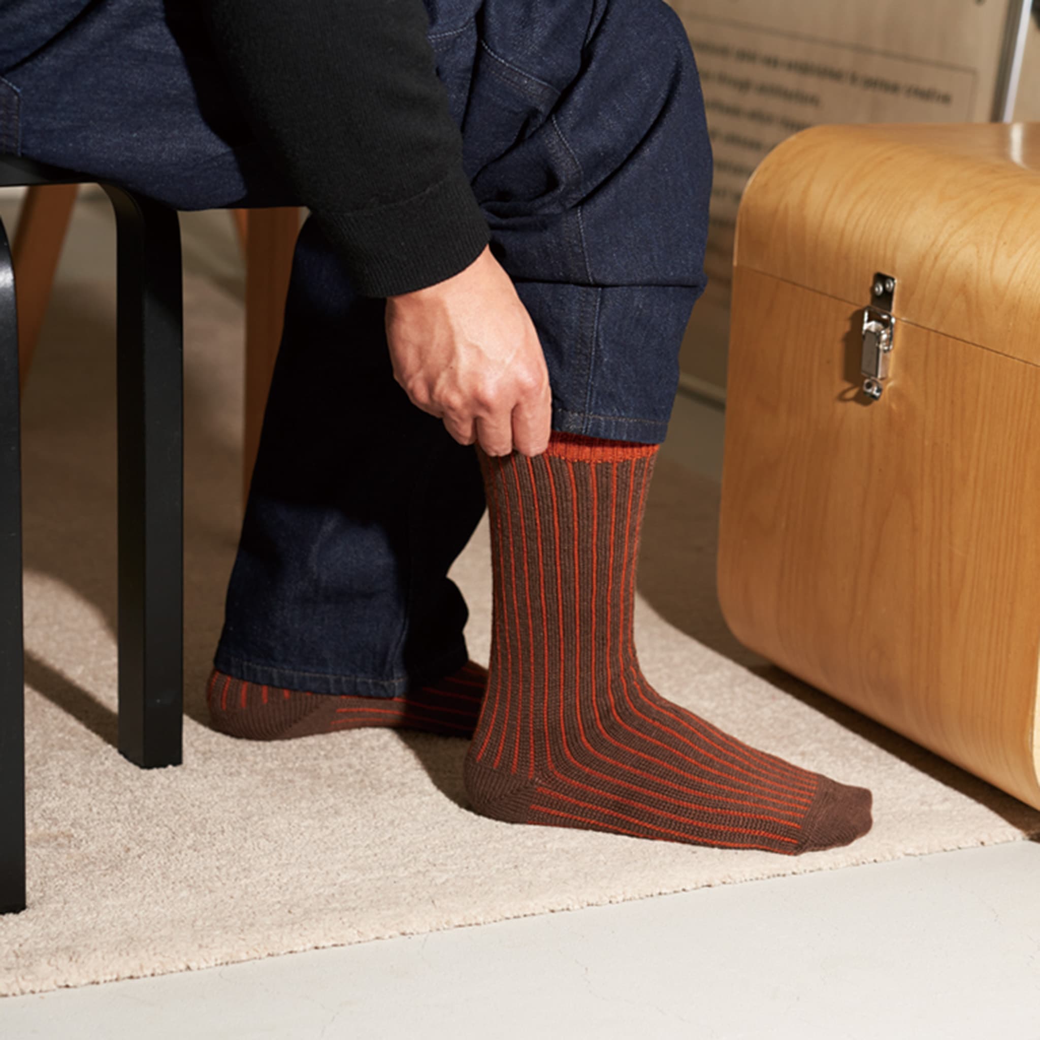 何気ない2トーンのリブ編みソックスですが、実はとっても奥が深く、ローゲージで2色の糸をループさせながら編むことは相当熱練な職人技が隠れています。