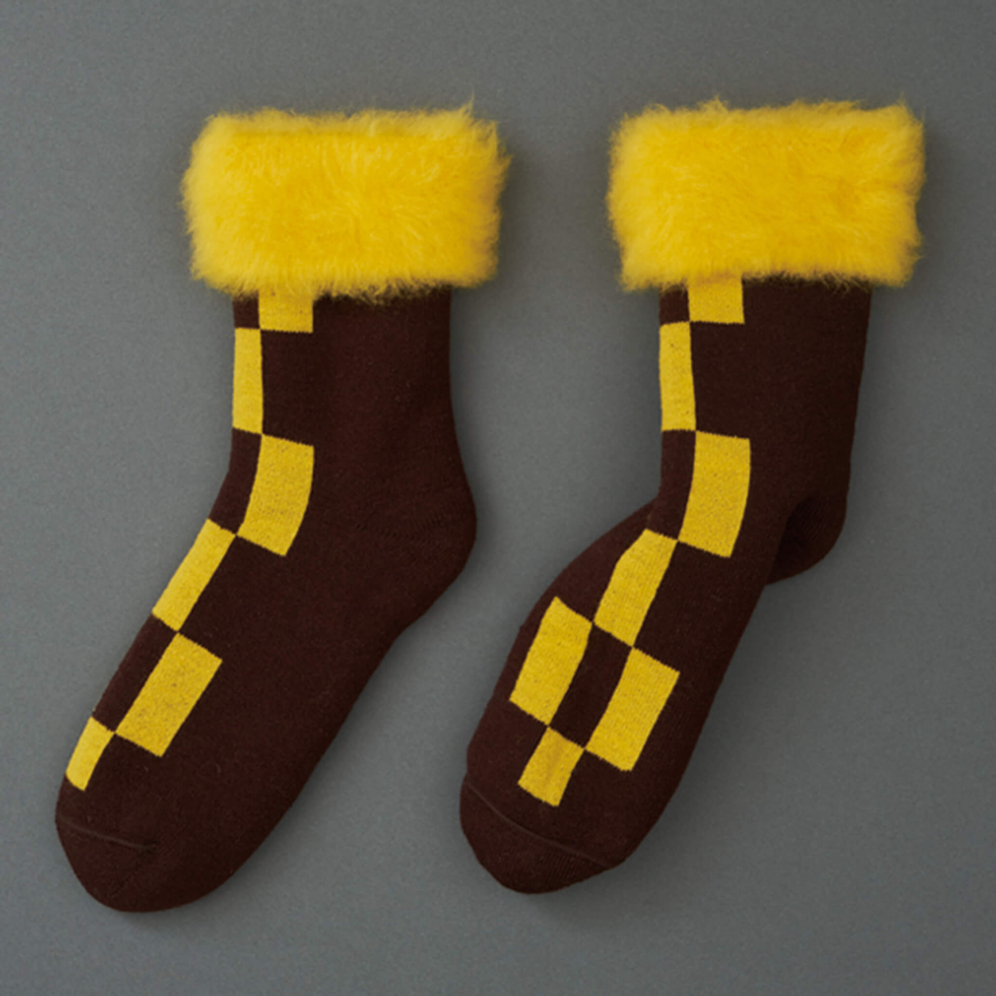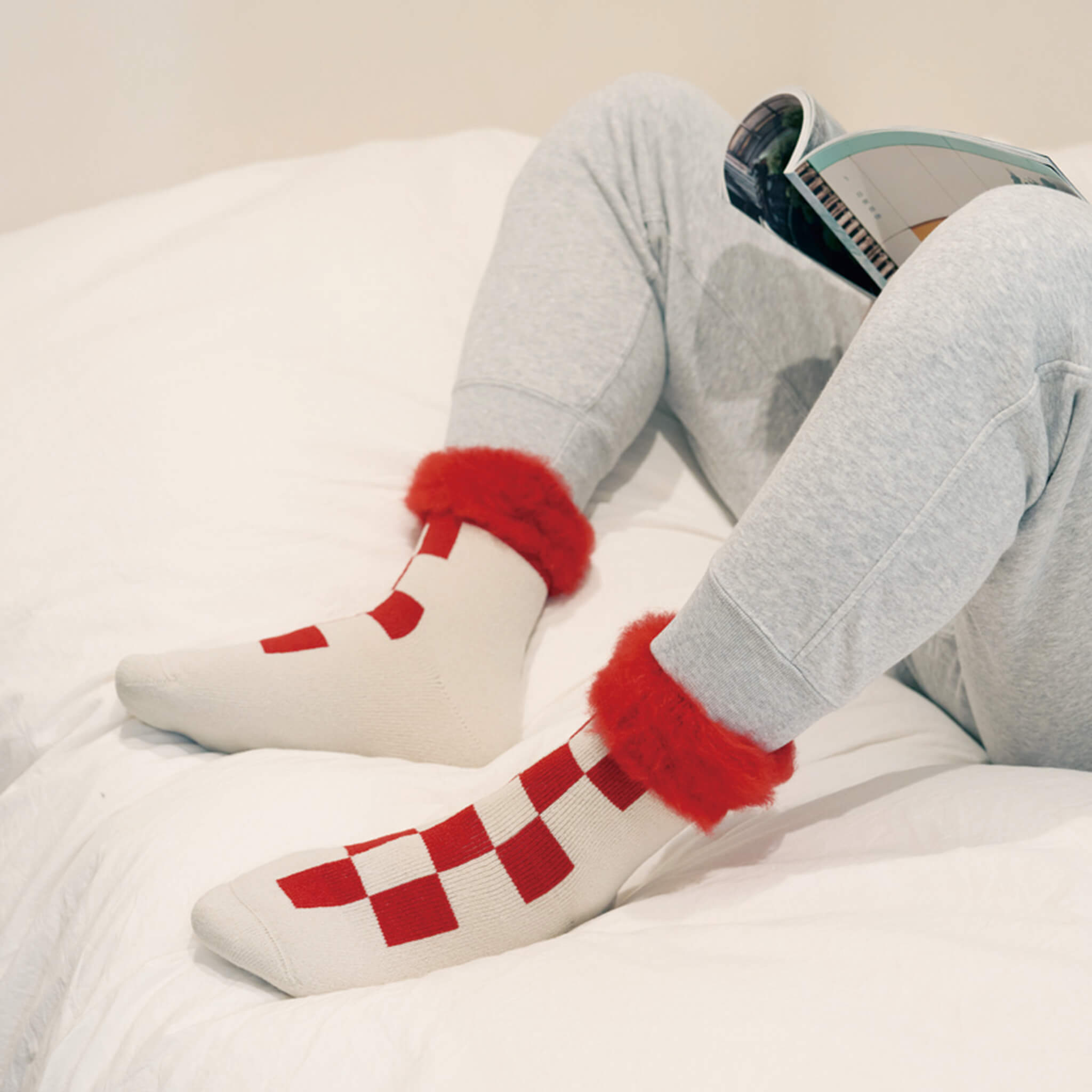 テキスタイルアーティストのミズタユウジ氏がデザインしたフラッフィーソックスは右や左、後ろや前など、見る角度で表情が異なるユニークな柄です。
