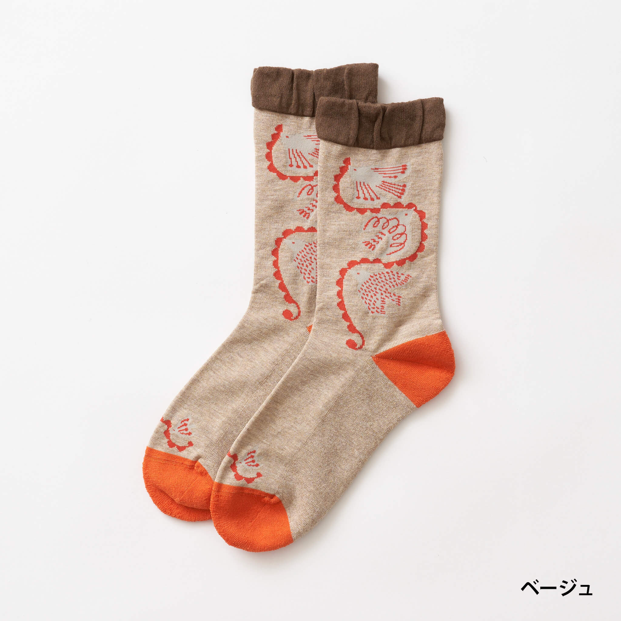 秋口にぴったりの温かみのあるカラーリングに、細部の繊細な柄を表現した鳥が飛び交っているfromFらしい靴下です。