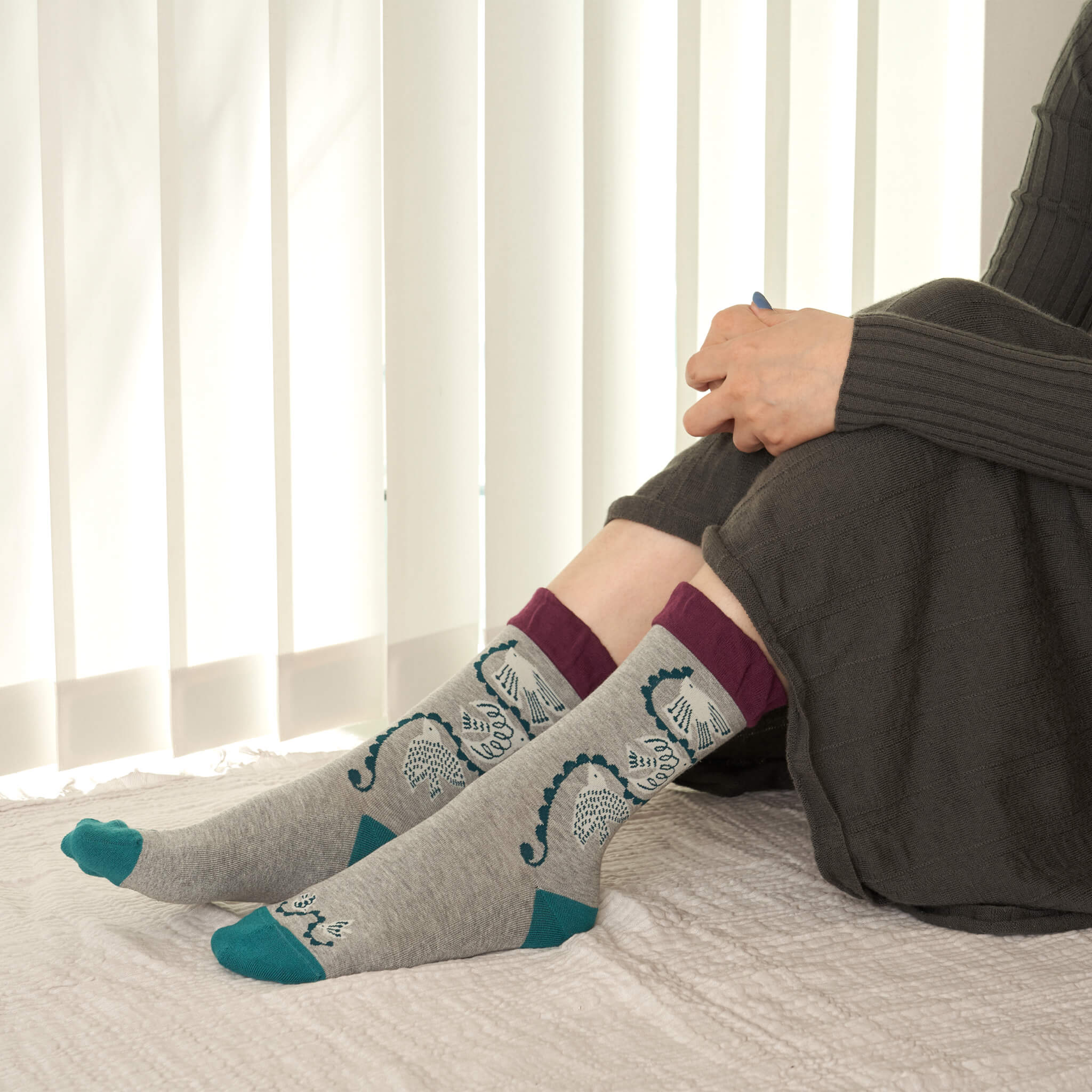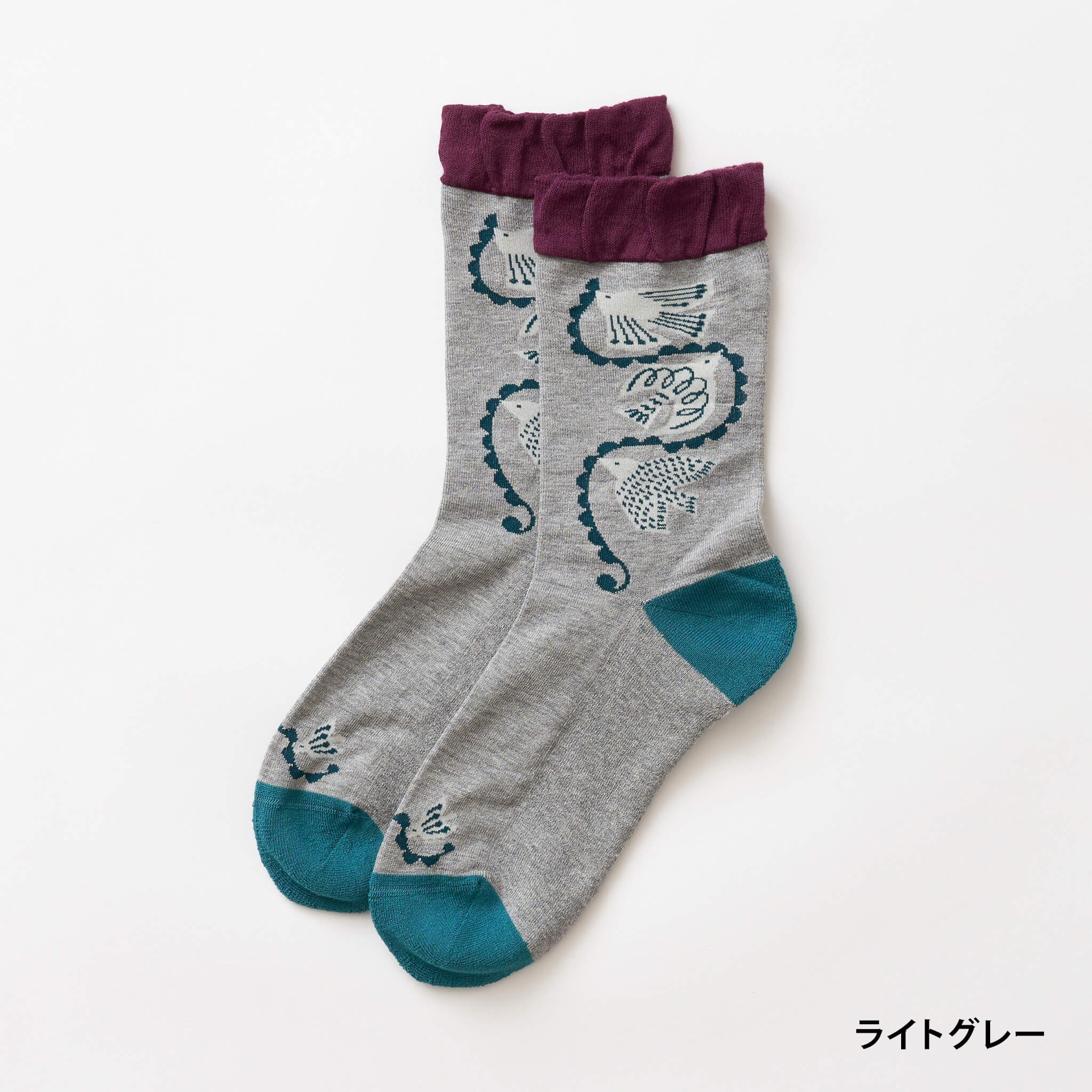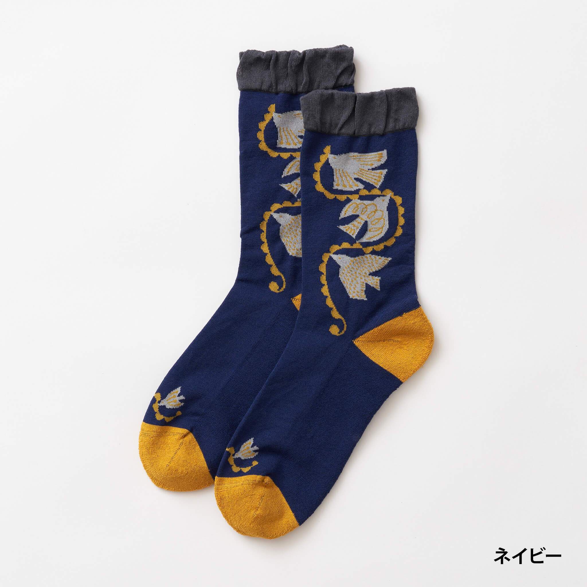 バイカラーの履き口と可愛い鳥の模様がポイント