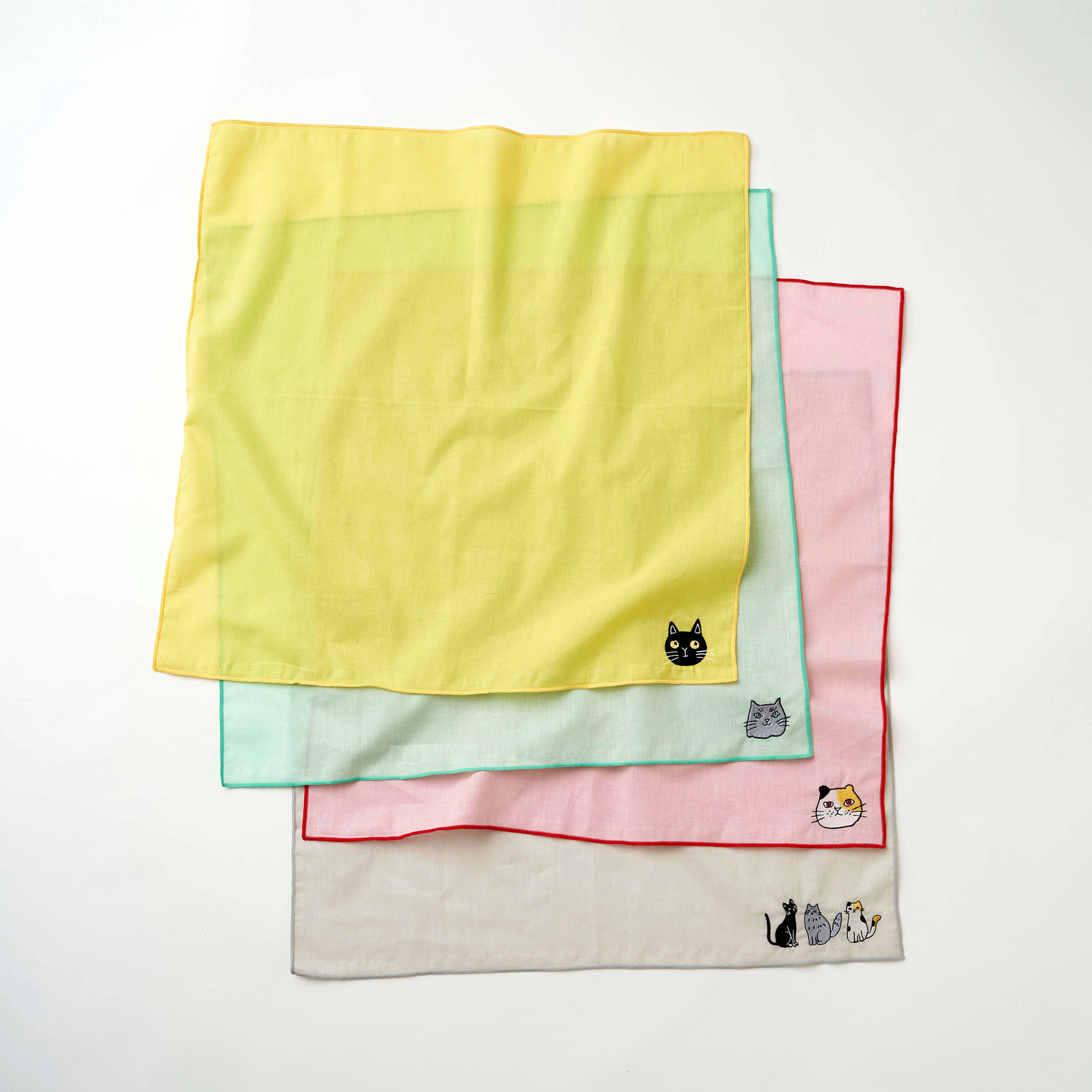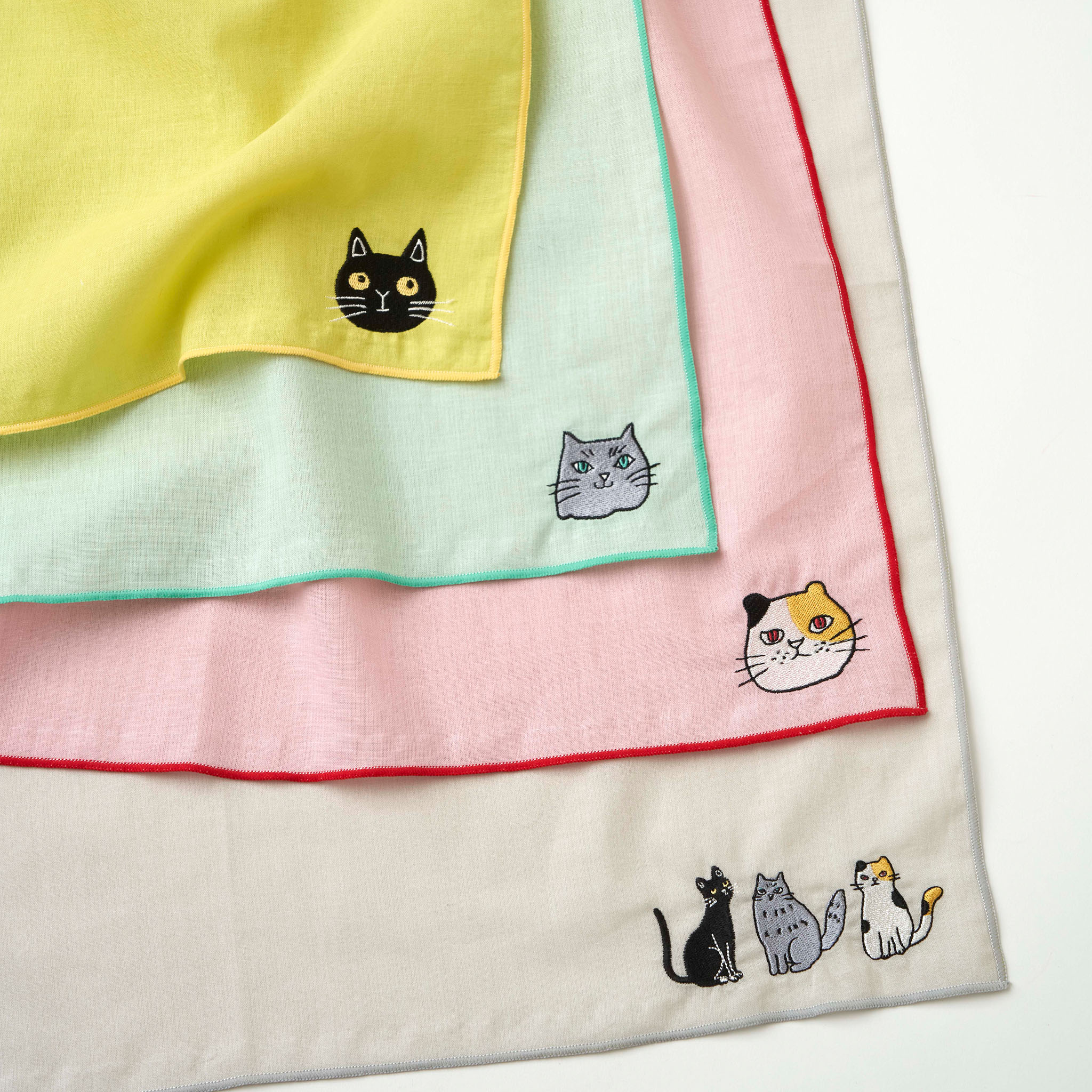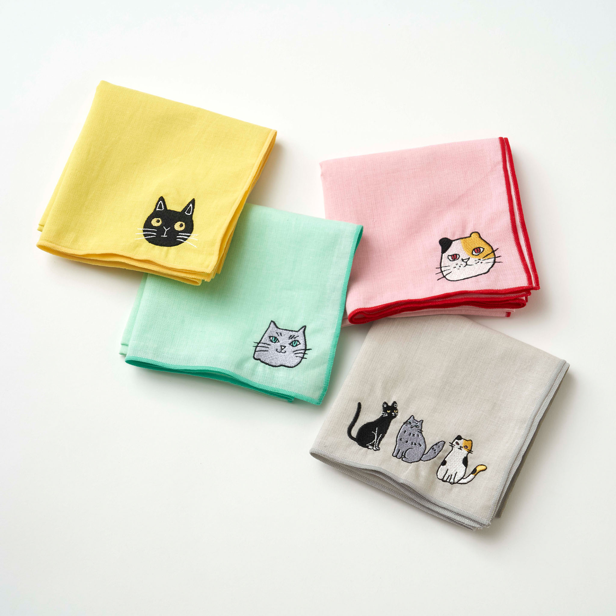 ミャウそれぞれのお気に入りカラーをベースにした、カラフルで楽しいハンカチ。